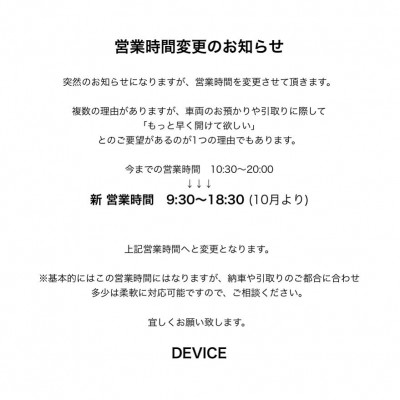 お知らせ突然にはなりますが…10月より当店の営業時間を変更致します。